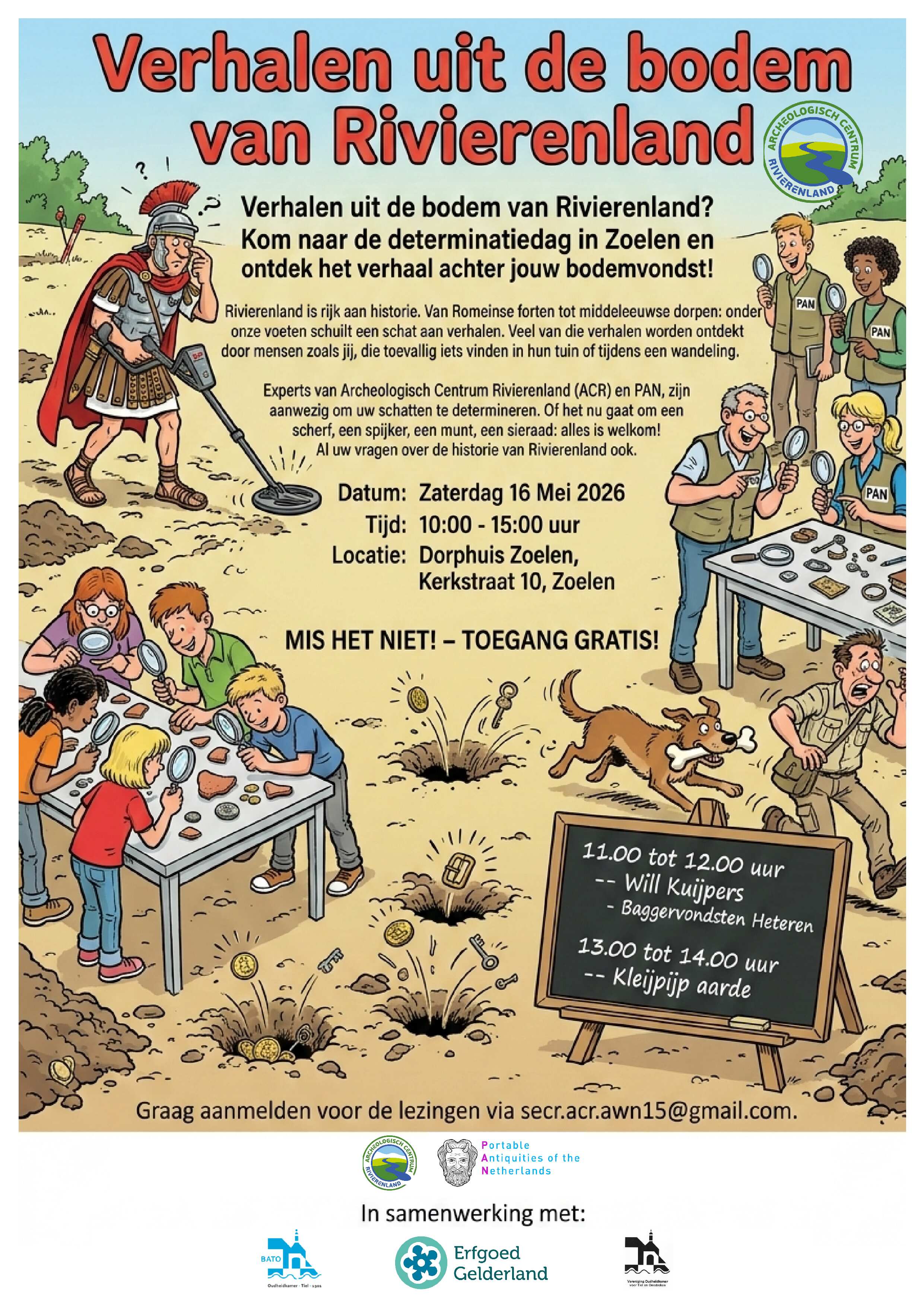 Experts van Archeologisch Centrum Rivierenland (ACR) en PAN, zijn aanwezig om uw schatten te determineren. Of het nu gaat om een scherf, een spijker, een munt, een sieraad: alles is welkom! Al uw vragen over de historie van Rivierenland ook.